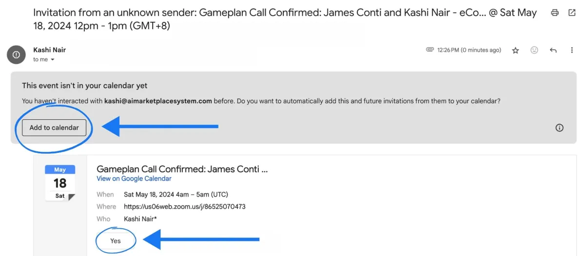 clicking 'Yes' in the email calendar invitation.